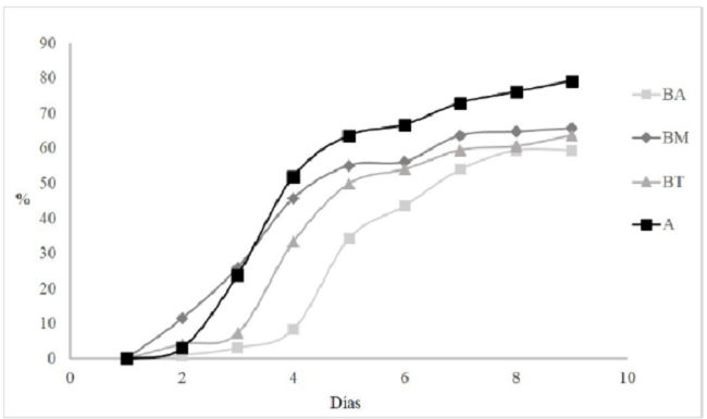 No se encontró diferencia estadísticamente significativa (p>0.05) en el efecto del bocashi en la emergencia de las semillas de rábano (Figura 2). La mayor germinación se obtuvo en el suelo agrícola (79.16%), seguido del bocashi BM (65.62%), después el bocashi BT (63.54%) y la menor se obtuvo en el bocashi BA (59.37%). También es importante destacar que la germinación fue más rápida en el suelo agrícola que en las mezclas de bocashi. En cuanto al IVG, los índices obtenidos fueron: BA) 6.5972; BM) 7.2916; BT) 7.0601 y en SA) 8.7962.