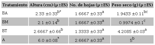 En la Tabla 2, se presentan las medias de las variables altura, número de hojas y biomasa seca de las plantas de rábano. En cuanto a la altura, se encontró diferencia estadísticamente significativa (p<0.05), siendo mayor la altura en el tratamiento testigo, con suelo agrícola (6.0 cm) y la menor altura se encontró en el bocashi BM (2.1 cm). Para el número de hojas no se encontró diferencias significativas (p>0.05) en el efecto del suelo agrícola con respecto de las diferentes mezclas de bocashi, es decir, el número de hojas fue similar en todos los tratamientos, aun así, el mayor número se obtuvo con el tratamiento testigo, con suelo agrícola (2.66 hojas), y el menor se obtuvo en el bocashi BT (1.33 hojas).