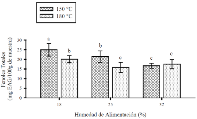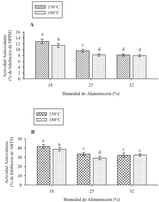 Repo-Carrasco-Valencia et al. (2009), estudiaron el efecto del proceso de extrusión sobre la actividad antioxidante de 2 variedades de Amaranthus caudatus en donde reportaron una disminución en la actividad antioxidante por efecto de la extrusión en un rango del 16 al 58 %. En el presente estudio, aun cuando se presentaron diferencias en los porcentajes de inhibición entre ambos radicales, el porcentaje de reducción debido al proceso de extrusión fue semejante. Se obtuvo una reducción del 56-57 % para el tratamiento mayormente afectado (180 °C y 32 %) y 33-34 % para las condiciones de extrusión que presentaron un menor efecto (150 °C y 18 %). Esta reducción puede deberse a reacciones polimerización de compuestos fenólicos durante el procesamiento que los hace menos extraíbles y por lo tanto presentan una menor contribución a la actividad antioxidante (Brennan et al., 2011; Wang et al., 2014).