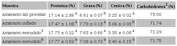 Los resultados de la composición proximal del grano de amaranto sin procesar, amaranto inflado comercial y los tratamientos de extrusión a las condiciones menos (150 °C y 18 % de humedad) y más drásticas de procesamiento (180 °C y 32 % de humedad), se presentan en la Tabla 1. Se observa que no se presentaron diferencias significativas entre amaranto sin procesar y extrudido, lo que indica que a las condiciones de proceso empleadas no afectan el contenido total de proteína, grasa y ceniza. Las diferencias obtenidas en el amaranto inflado comercial respecto a cenizas pueden deberse a variaciones en el lote de materia prima utilizada o bien al proceso de expansión comercial, que puede ocasionar que parte del pericarpio se pierda.
