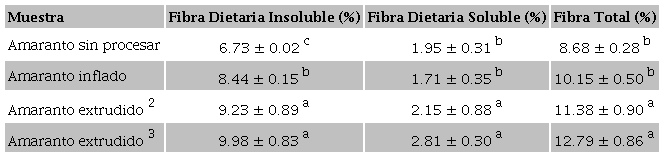 Los resultados de la determinación de fibra dietaria se presentan en la Tabla 2. Los valores encontrados para harinas de amaranto extrudidas son comparables a lo publicado por Dyner et al. (2016) quienes reportaron 12.4 % de fibra dietaria total en harina integral de amaranto extrudida y 11.9 % para la harina integral sin extrudir. En la presente investigación el tratamiento térmico por extrusión mostró diferencias significativas (p<0.05) en el contenido de fibra dietaria total, así como en la fracción soluble e insoluble, con respecto al amaranto sin procesar y comercial. Lo anterior coincide con Capriles et al. (2008) quienes reportaron un aumento en el contenido de fibra soluble después de la extrusión. Pedersen et al. (1990), trabajaron con semillas de amaranto pálidas y negras, y reportaron que el proceso de inflado y tostado aumenta la proporción de fibra soluble del 33 al 39 %, posiblemente debido a la formación de almidón resistente.
