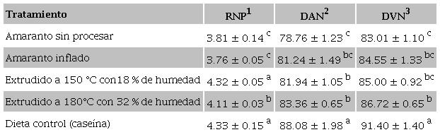 Los resultados de digestibilidad (DAN y DVN) mostraron que no se presentaron diferencias significativas entre extrudidos y amaranto inflado, pero si con respecto al grano sin procesar que tuvo la menor digestibilidad de todos los tratamientos. Esto pudiera deberse a factores antifisiológicos los cuales interfieren con la digestibilidad de la proteína. Se ha reportado que la presencia de fibra disminuye la absorción de algunos nutrientes, lo que resulta en una baja digestibilidad, y a su vez aumenta la excreción endógena de nitrógeno fecal (Wong y Cheung, 2003); sin embargo, el efecto presentado puede atribuirse a la presencia de antinutrientes en el grano sin procesar ya que todas las dietas experimentales fueron ajustadas al mismo contenido de fibra. Aunque no se presentaron diferencias significativas entre tratamientos de extrusión y el inflado comercial, en general la tendencia fue que se obtuvieron mayores digestibilidades en los tratamientos extrudidos, lo cual, si alcanzó a evidenciarse en el parámetro de RNP, donde el tratamiento de extrusión de 150 °C y 18 % presentó valores comparables a la proteína de referencia (caseína).