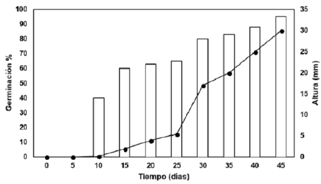 En la presente investigación, se seleccionaron las semillas como explantes, dado que el establecimiento de cultivos in vitro no fue exitoso con hojas, pseudobulbos ni con raíces (resultados no mostrados), debido a la falta de respuesta de los tejidos en los medios adicionados con auxinas o citocininas. Posterior a los 45 días de cultivo, la germinación de las semillas de L. anceps subsp. anceps alcanzó el 95 % y se observó la formación de cuerpos similares a protocormos (PLB´s: Protocorm Like Bodies), de igual manera, la longitud de las plántulas germinadas también aumentó alcanzando aproximadamente los 30 mm en promedio (Figura 1). En cuanto al aspecto morfológico, las semillas comenzaron a hincharse y los embriones comenzaron a desarrollar un color verde-amarillento que terminó en color verde (Figura 2A), además se presentó la aparición de las primeras hojas a los 23 días de cultivo (Figura 2B). La mayor tasa de crecimiento se observó a los 45 días (0.66 mm/día). Sin embargo, la conservación de las plántulas en este medio durante más de 65 días indujo oxidación y necrosis tisular.