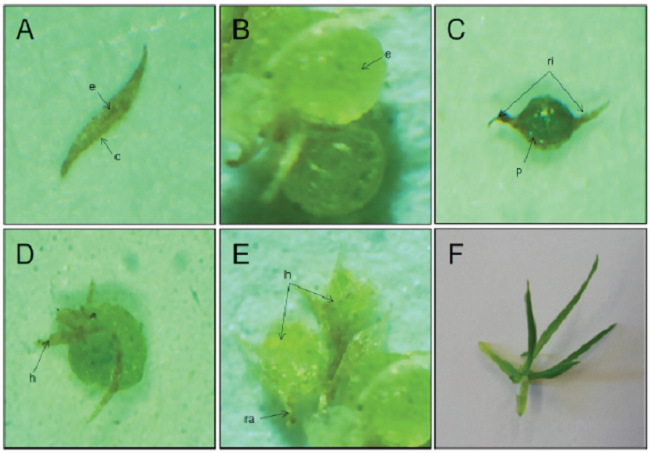 Para la inducción de nuevos brotes, se transfirieron hojas individuales de al menos 1 cm de longitud a medio MS suplementado con las diferentes concentraciones de BAP y KNO3. La aparición de los nuevos brotes se manifestó mediante protuberancias pequeñas de color verde con la aparición de rizoides y las primeras hojas (Figura 2C, D) después de dos semanas de cultivo. La formación de los nuevos brotes aumentó de forma gradual en los tratamientos adicionados con BAP (Figura 2E).