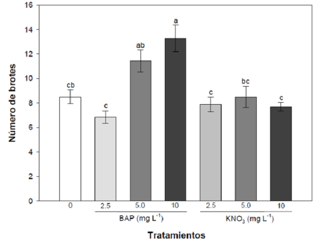 La mayor producción de brotes se encontró en el tratamiento adicionado con 10 mg L-1 de BAP el cual produjo 13.2 ± 1.1 brotes el cual fue estadísticamente significativo con respecto al control. La producción de brotes en los tratamientos adicionados con KNO3 fueron similares cuando se compararon con el tratamiento control y la adición de 2.5 mg L-1 de la citocinina BAP (Figura 3).
