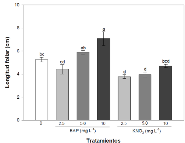 No existen hasta el momento reportes científicos donde se haya analizado el efecto del KNO3 sobre la longitud foliar en orquídeas, sin embargo, en brotes de Musa sp. Cv. Cavendish se encontró que la adición de KNO3 no produce efectos significativos en la altura de los brotes provenientes de plantas propagadas in vitro (Montenegro-Juárez et al., 2014).