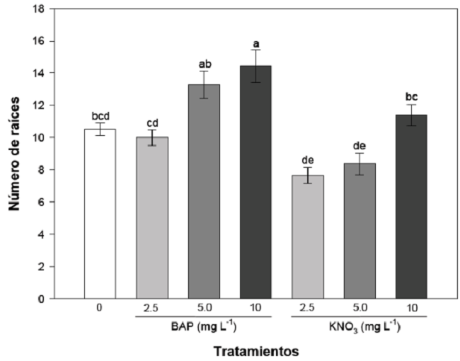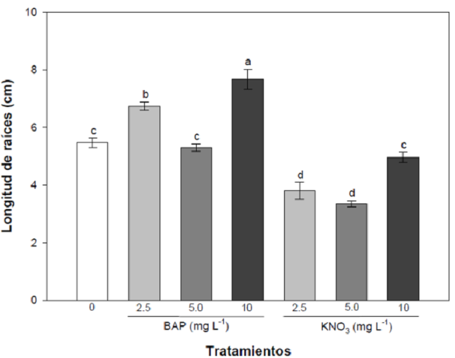 Las raíces de las plántulas sembradas en los tratamientos adicionados con 2.5 y 5.0 mg L-1 de KNO3 alcanzaron una longitud de 3.8 ± 0.2 y 3.3 ± 0.1 cm, respectivamente, siendo estos los tratamientos con los resultados más bajos. Las plántulas bajo el tratamiento adicionado con 10 mg L-1 de KNO3 desarrollaron una longitud radicular de 4.9 ± 0.1 cm, este efecto fue similar al observado en el tratamiento control (5.4 ± 0.1 cm) y al tratamiento adicionado con 5.0 mg L-1 de BAP (5.3 ± 0.1) sin diferencias estadísticas entre estos tratamientos (Figura 7).