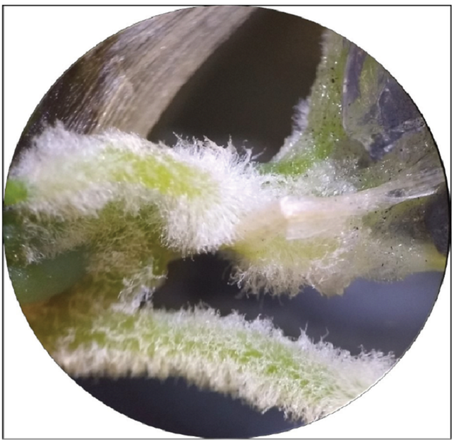 Para el proceso de rizogénesis en los diferentes tratamientos adicionados con BAP y KNO3 se evaluaron dos variables: 1) la producción del número de raíces y 2) la longitud que alcanzaron las raíces desarrolladas. Para el número de raíces se detectó que la mayor producción se obtuvo al agregar 10 mg L-1 de BAP, donde se produjeron un promedio de 14.4 ± 0.9 raíces. Los tratamientos con las concentraciones de 2.5 y 5.0 mg L-1 de KNO3 mostraron los valores más bajos para la producción de raíces (7.6 ± 0.5 y 8.3 ± 0.6 raíces respectivamente) y el tratamiento adicionado con 10 mg L-1 de KNO3 fue similar a los tratamientos adicionados con BAP y al tratamiento control, formando 11.4 ± 0.6 raíces (Figura 5). Además, las raíces que se produjeron bajo este tratamiento desarrollaron una estructura radicular conocida como velamen (Figura 6), tejido esponjoso constituido por células muertas sin citoplasma, el cual capta el agua del ambiente dejándola disponible para su absorción al interior de la raíz (Chomicki et al., 2015). En la Figura 2 F se puede observar una vitroplanta con hojas y raíces completamente desarrolladas, en la cual la formación de velamen radicular podría favorecer el subsecuente proceso de aclimatación.