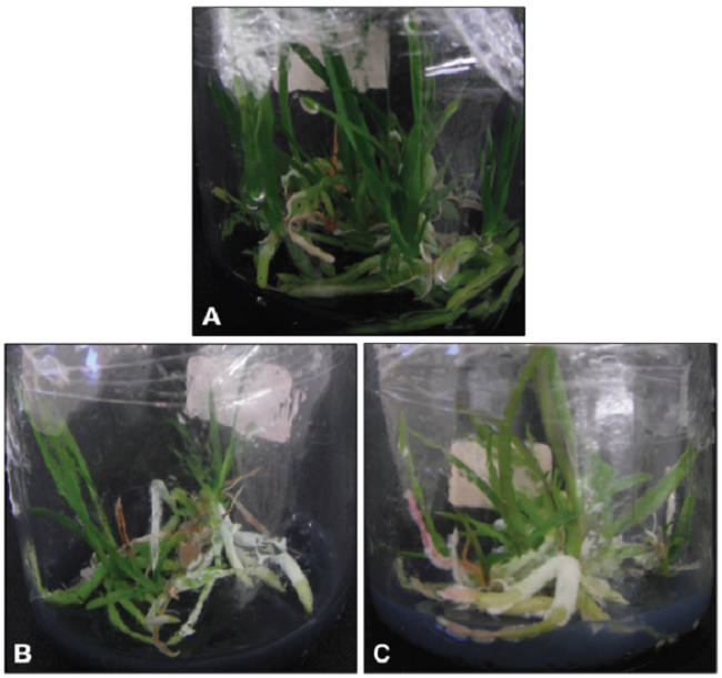 Finalmente, la Figura 8 muestra una comparación general entre las vitroplantas del tratamiento control, las desarrolladas en medios enriquecidos con BAP y en medios con KNO3. Las vitroplantas en el tratamiento control manifestaron un buen desarrollo foliar con buena producción de raíces (Figura 8A), en tanto que, se observó una clara diferencia entre el sistema radicular desarrollado en las plantas con BAP donde no se produjo velamen (Figura 8B), en comparación con las plantas adicionadas con KNO3, donde el velamen radicular fue evidente, además de que la coloración de las raíces se observó de un color verde más intenso (Figura 8C) comprobando con esto el efecto benéfico de este tratamiento en el desarrollo de las vitroplantas.