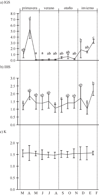 Los índices somáticos calculados para la cabrilla arenera fueron afectados significativamente (P<0.05) a través del año, en términos de IGS (Fig. 3A) e IHS (Fig. 3B) pero no para K (Fig. 3C). Los valores obtenidos para el IGS fueron estadísticamente mayores durante los meses de abril (5.4%) y febrero (3.3%) en comparación con el resto de los meses evaluados, mientras que el IHS mostró su mayor valor en febrero (2.2%) en comparación con los valores obtenidos en los meses de marzo (1.2%), agosto (1.1%), septiembre (1.2%) y enero (1.1%). Los valores obtenidos para K mostraron valores que fueron de 1.5% a 1.6%, sin mostrar diferencias significativas.