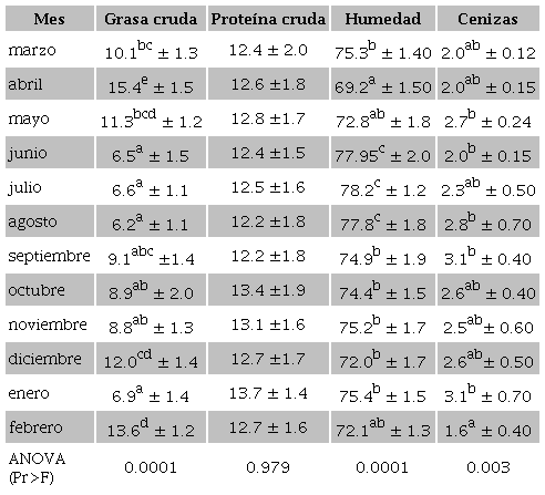 En análisis proximal de gónada mostró diferencias significativas a través del año en términos de grasa cruda, humedad y cenizas pero no se encontraron diferencias para proteína cruda (Tabla 1). Los valores de grasa cruda mostraron una variación significativa, en donde el valor más alto se observó en abril (15.4%); adicionalmente, los valores más bajos se registraron en los meses de junio (6.5%), julio (6.6%), agosto (6.2%) y enero (6.9%). Los valores de humedad en el tejido gonadal mostraron también una variación significativa; los valores más altos se registraron en junio (77.9%), julio (78.2%) y agosto (77.8%), mientras que el valor mínimo se observó en abril (69.2%). El contenido de cenizas mostró los valores más altos en enero y septiembre , mientras que el valor mínimo se observó en febrero. La proteína se mantuvo estable a través del año, con valores medios que fueron de 12.2% a 13.4%.