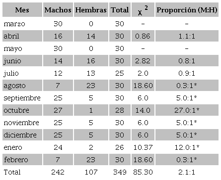La proporción de sexos obtenida para la cabrilla arenera mostró una variación significativa a través de los 12 meses de muestreo (Tabla 2). Se observó que los machos dominaron significativamente la población de septiembre a enero, mostrando valores de proporción que fueron desde 5 a 1 hasta 27 a 1. Por el contrario, se observó una dominancia significativa de las hembras durante los meses de agosto y septiembre, mostrando una proporción (Macho:Hembra) de 0.3 a 1, mientras que durante los meses de abril (1.1:1), junio (0.4:1) y julio (0.9:1) no se observaron diferencias significativas.