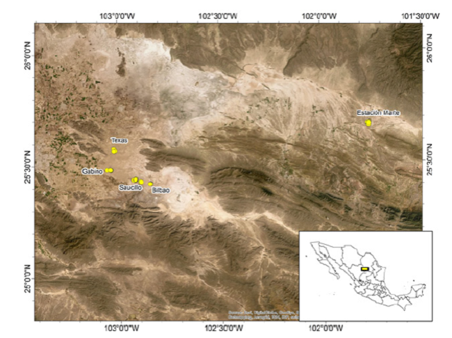 El estudio se realizó tratando de abarcar todas las regiones de dunas del suroeste del Estado de Coahuila, en donde se ha reportado la distribución de U. exsul (Schmidt y Bogert, 1947; Gadsden et al., 2001; García de la Peña et al., 2005). Se delimitaron las poblaciones de la especie y se realizaron 14 salidas al campo durante los años 2016 y 2017, donde se muestrearon cinco individuos en cuatro poblaciones (Bilbao, Saucillo, Gabino, Texas) y cuatro individuos en la población de Estación Marte, para un total de 24 muestras (Figura 1). La captura se realizó manualmente mediante la técnica del lazado corredizo, se registró la fecha y las coordenadas geográficas de cada punto de colecta.