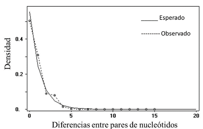 Las secuencias de nucleótidos fueron leídas y editadas con Chromatogram Explorer v. 5.0.2.3 (Heracle Biosoft SRL, 2006). Las secuencias se alinearon con ClustalW en Mega7 (Kumar et al., 2016). Se llevó a cabo el análisis de polimorfismo del ADN en el programa DnaSP v.5.10.01 DNA sequence polymorphism, de sus siglas en inglés (Librado y Rosas, 2009) para los siguientes parámetros: diversidad nucleotídica (π), la diversidad haplotípica (Hd), la D de Tajima para determinar la selección o deriva de las poblaciones y para determinar el estado poblacional en cuanto a expansión o estabilidad. Además, la lista y dispersión de los haplotipos para establecer la identidad de cada haplotipo en la red. Se implementó una AMOVA mediante el programa PopArt 1.7 (Population Analysis with Reticulate Trees) de sus siglas en inglés (Clement, 2002), para determinar la variación genética poblacional (Yoke et al., 2006). Se usó el programa DNAsp 5.10.01 para obtener diversas medidas de la heterogeneidad genética entre las poblaciones: Kst, Kxy y Fst (Hudson et al., 1992), con pruebas de permutación (aleatorización) de 1000 réplicas según Hudson et al. (1992a). También se utilizó el programa DNAsp 5.10.01 para realizar un análisis de dispersión “mismatch”. El cual permite la discriminación entre las poblaciones que se mantuvieron estables en el tiempo (curvas multimodales) y la población que experimentó una expansión demográfica desde una pequeña población fundadora (curvas unimodales).