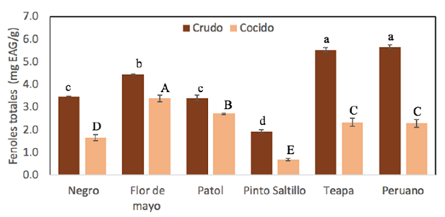 Se determinó el contenido de fenoles en las diferentes variedades de frijol antes y después del cocimiento (Figura 2). Los valores obtenidos en nuestro estudio oscilan entre 1.91 a 5.66 mg EAG/g en frijol crudo y valores de 0.68 a 3.47 mg EAG/g en frijol cocido. Las variedades de frijol Teapa y Peruano son las que presentaron mayor cantidad de fenoles totales antes del cocimiento. Sin embargo, después del cocinado disminuyen más de la mitad. Las variedades Flor de Mayo y Patol son las que conservan la mayor cantidad de compuestos fenólicos después de haberlos sometido a cocimiento.
