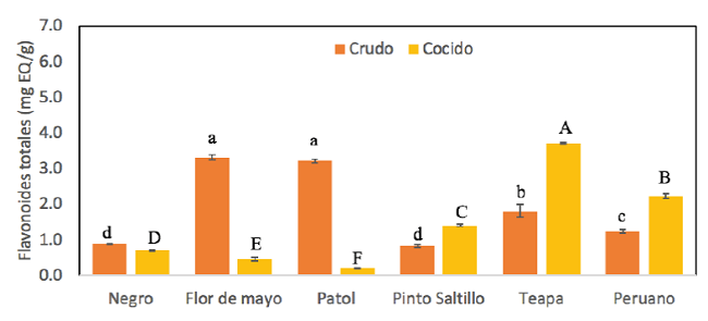 Se determinó el contenido de flavonoides en las diferentes variedades de frijol antes y después del cocimiento (Figura 3). Los valores obtenidos en nuestro estudio oscilan entre 0.83 a 3.31 mg EQ/g en frijol crudo y valores de 0.21 a 3.70 mg EQ/g en frijol cocido, cantidades más bajas a los fenoles debido a que son un subgrupo de compuestos fenólicos. Sin embargo, las variedades de frijol crudo Flor de Mayo y Patol presentaron la mayor cantidad de flavonoides, pero también son los que presentan mayor disminución de los mismos después del cocimiento. En cambio, las variedades Teapa, Peruano y Pinto Saltillo, mostraron un incremento de flavonoides después del cocinado. Huber et al. (2016) menciona que cuando el frijol se somete a cocimiento se presenta un aumento de flavonoides. Contrariamente, Xu et al. (2009), reportan que remojar y cocinar el frijol ejerce un efecto negativo en las concentraciones de flavonoides. Por lo que en nuestro estudio el procesamiento de cocción causó ambos efectos en las distintas variedades de frijol.