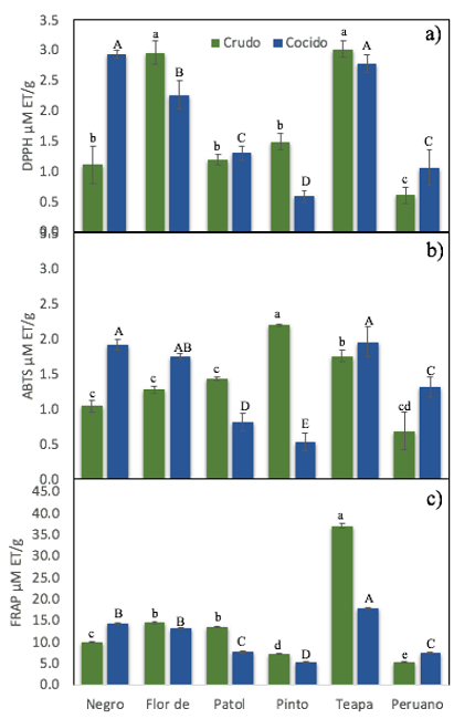 Los resultados obtenidos en capacidad antioxidante por DPPH, ABTS y FRAP en las diferentes variedades de frijol antes y después del cocimiento se pueden observar en la Figura 4. Los valores obtenidos en nuestro estudio oscilan entre 0.60 a 3.01 µM ET/g en frijol crudo y valores de 0.58 a 2.90 µM ET/g en frijol cocido en DPPH; 0.68 a 2.18 µM ET/g en frijol crudo y valores de 0.52 a 1.94 µM ET/g en frijol cocido en ABTS; y 5.24 a 36.99 µM ET/g en frijol crudo y valores de 5.22 a 17.80 mg EAG/g en frijol cocido en FRAP. La cocción incrementó la actividad antioxidante del radical DPPH en las variedades de frijol Negro y Patol. Sin embargo, disminuyó en las variedades de Flor de Mayo y Pinto Saltillo. En Teapa se mantuvo estable. En ABTS las variedades de Negro, Flor de Mayo, Teapa y Peruano observaron un incremento de la actividad antioxidante después del cocimiento, mientras que en Patol y Pinto Saltillo decreció. Para FRAP casi todos estuvieron estables con ligero aumento en Negro y Peruano, y ligera disminución en Flor de mayo, Patol y Pinto Saltillo. Solo la variedad Teapa presentó una disminución considerable del 52 % después del cocimiento.