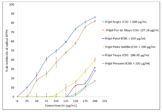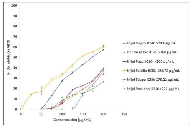 En la Figura 5 se observa la cinética de inhibición al radical DPPH para determinar la concentración inhibitoria media (IC50) de los extractos de frijol, en donde las variedades Teapa con 106.45 µg/mL y Flor de Mayo con 127.16 µg/mL, fueron las que alcanzaron el 50 % de inhibición en las concentraciones estudiadas. En ABTS (Figura 5), las variedades de Teapa con 176.21 µg/mL y Pinto Saltillo 154.72 µg/mL, fueron las muestras que lograron alcanzar la IC50 en este radical. La composición de los extractos juega un papel importante para poseer capacidad antioxidante. Generalmente con el método de extracción que se utilizó en este estudio, se obtienen compuestos fenólicos. De todos los compuestos fenolicos, el grupo de los flavonoides es el más extendido en la naturaleza y dentro de ellos, los flavonoles son los que poseen un mayor potencial antioxidante (Perez-Perez et al., 2018). Sin embargo, para poder explicar si estos compuestos confieren realmente la mayor capacidad antioxidante, se realizaron correlaciones (Tabla 2).