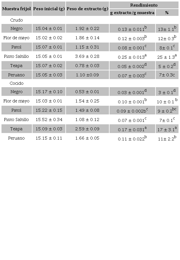 El rendimiento de los extractos crudo y cocido obtenidos de cada una de las muestras de frijol se observan en la (Tabla 1). La variedad Pinto Santillo, obtuvo el mayor rendimiento del extracto de frijol crudo. Así como, un decremento en el rendimiento del extracto cocido en las variedades de frijol negro, Flor de Mayo y Pinto Saltillo. Sin embargo, las variedades de frijol Teapa y Peruano incrementaron 3.4 y 1.57 veces respectivamente respecto al crudo, mientras que el frijol Patol prácticamente no se vio afectado.