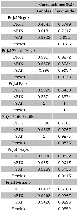 De acuerdo a las correlaciones realizadas con las diferentes muestras de frijol, los flavonoides son los principales componentes de los compuestos fenólicos ya que en cada muestra la correlación de fenoles con flavonoides fue muy alta (R2 > 0.96). Estos compuestos parecen ser que son los responsables de conferir la capacidad antioxidante y/o poder reductor en frijol Negro (FRAP), Flor de mayor (DPPH y FRAP), Patol (ABTS y FRAP), Pinto Saltillo (ABTS y FRAP), Teapa (DPPH y ABTS) y Peruano (ABTS y FRAP). Al parecer, los compuestos que conforman a los diferentes extractos de frijol son más afines al radical ABTS que al DPPH, y confieren mayor poder reductor en FRAP. Estas diferencias pueden deberse a que el radical ABTS puede reaccionar con compuestos aromáticos hidroxilados en un amplio rango de pH, factor que limita al radical DPPH ya que trabaja con pH neutros o alcalinos (Prior et al., 2005; Roginsky y Lissi, 2005). Por otra parte, ambos radicales pueden ser donadores de H+ pero el DPPH no reacciona con ácidos aromáticos que contienen solo un grupo OH ni tampoco con fenoles que no contengan un OH en el β-anillo (Yokosawa et al., 1998). Sin embargo, para poder confirmar lo anterior, se deberán identificar por HPLC los compuestos individuales de cada muestra.