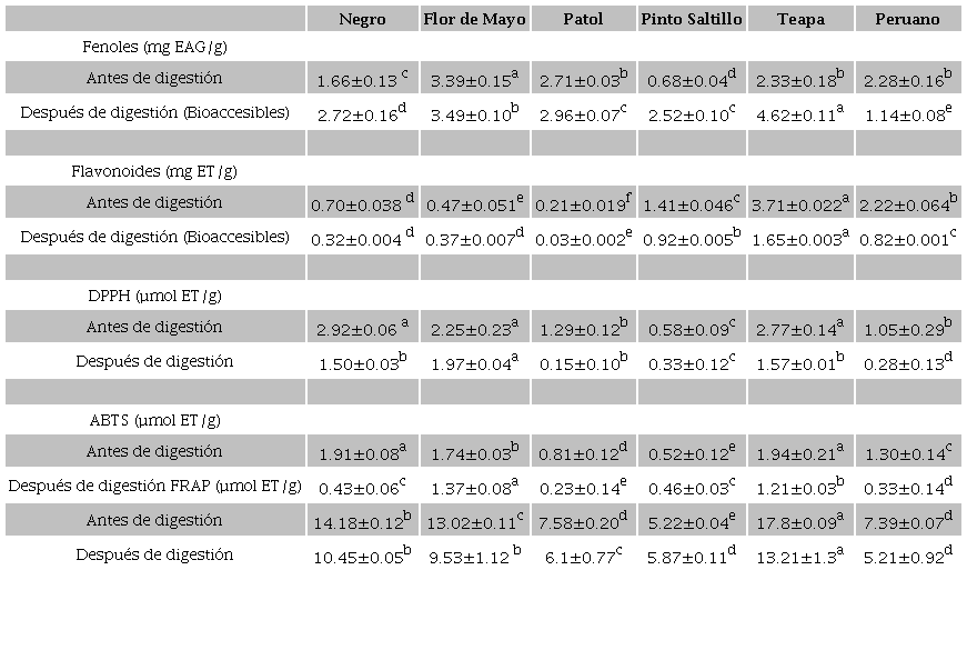 En la Tabla 3, se observa el contenido fenólico y actividad antioxidante de las diferentes variedades de frijol cocido y a través de un proceso de digestión in vitro. Los fenoles presentaron un incremento en todas las muestras que van de un rango de 1.14 a 4.62 mgEAG/g, siendo la variedad Teapa la de mayor incremento. Esto pudo deberse a que el proceso de digestión consiguió liberar o dejar más libres a los compuestos fenólicos que están dentro de la matriz alimentaria, por lo tanto están más bioaccesibles. Sin embargo, con los flavonoides pasa lo contrario, parece ser que se degradan o bien se pueden transformar en compuestos con menos actividad antioxidante. Por lo que en este estudio y en otros similares en los que el frijol ha sido remojado, se presenta que el menor nivel de biodisponibilidad de los compuestos se debe a que después del remojo se lleva a cabo la liberación de compuestos fenólicos en el agua en que fueron remojados. Así mismo, Yuwei et al. (2014) presentan valores de frijol sin remojar de 3.24 y 4.86 mg GAE/g en fenoles y valores de 0.24 a 1.38 mgCE/g muy parecidos a los obtenidos en este estudio. Autores como Surangi et al. (2013). mencionan que la biodisponibilidad de los flavonoides es relativamente baja debido a la absorción limitada y rápida eliminación. Más aún, los flavonoides son rápidamente metabolizados y las actividades biológicas de sus metabolitos no son siempre las mismas que las de sus predecesores. Por lo que, la biodisponibilidad de los flavonoides aún no se encuentra bien establecida.