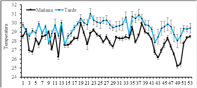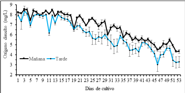 Los valores globales mínimo, máximo y promedio (± DE) de la temperatura del agua en los tanques de cultivo registrados por la mañana fueron de 25.2, 30.0 y 28.0°C (± 0.11°C), respectivamente, y por la tarde fueron de 27.5, 31.0 y 29.4°C (± 0.2°C), respectivamente. El comportamiento de esta variable se caracterizó por mantenerse estable durante la mayor parte del período de cultivo, tanto en las mediciones matutinas como vespertinas. Los valores promedios más altos se registraron por la tarde, pero sin existir grandes diferencias (< 2.0°C) con los registros de la mañana (Figura 1). Por su parte, la concentración de OD en los tanques de cultivo tuvo valores mínimo, máximo y promedio (± DE) por la mañana de 4.3, 8.6 y 6.9 mg/L (± 0.11 mg/L), respectivamente y por la tarde de 3.0, 8.4 y 6.0 mg/L) (± 0.21 mg/L), respectivamente. Aunque los niveles más altos de OD se registraron durante la mañana, las diferencias fueron mínimas con respecto a las mediciones vespertinas (< 1.0 mg/L). La concentración de OD se mantuvo en valores estables hasta el día 19 de cultivo, para después tender a una disminución progresiva hasta el final del experimento, como se muestra en la Figura 2. Este comportamiento estuvo asociado al incremento de la biomasa de los peces y, por lo tanto, a una mayor demanda de OD. Sin embargo, incluso los valores más bajos, registrados en las mediciones vespertinas al final del estudio, de aproximadamente 3.5 mg/L (Figura 2), se encuentran por arriba del valor mínimo crítico reportado para tilapia, de 0.8 mg/L a 26°C (Duy et al., 2008), de manera que el oxígeno disuelto nunca fue un factor limitante del crecimiento, ni representó riesgo para los cultivos. En cuanto al pH del agua, éste se mantuvo estable, con valores mínimo, máximo y promedio por la mañana de 7.33, 8.39 y 7.73 (± 0.06), respectivamente, y por la tarde de 7.04, 8.11 y 7.62 (± 0.07), respectivamente. Como es evidente de la información anterior, estos tres importantes parámetros físico-químicos del agua, temperatura, oxígeno disuelto y pH, se encontraron dentro de intervalos óptimos reportados para el cultivo de tilapia (El-Sayed, 2006). Por lo tanto, puede considerarse que el presente estudio se llevó a cabo bajo adecuadas condiciones de calidad de agua.