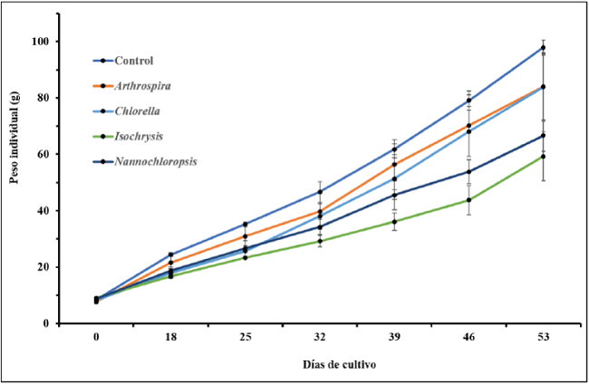 No existieron diferencias entre tratamientos en el peso de los organismos al inicio del experimento (Tabla 1), un requisito para lograr comparar objetivamente los posteriores resultados de crecimiento. Las mediciones semanales del peso permitieron monitorizar el crecimiento de los individuos a lo largo del estudio, como se muestra en la Figura 3. Desde el día 18 de cultivo, puede apreciarse una tendencia de mayor crecimiento en los peces alimentados con la dieta control, seguidos cercanamente de los peces que recibieron Arthrospira sp. y Chlorella sp., y menor desempeño en crecimiento en los peces que recibieron Isochrysis sp. y Nannochloroposis sp. El análisis estadístico de los parámetros de crecimiento evaluados al final del estudio confirmó que los peces de los tres primeros tratamientos (control, Arthrospira sp. y Chlorella sp.) alcanzaron los mayores valores de crecimiento, sin diferencias estadísticas entre ellos, con la única excepción del porcentaje de peso ganado de peces alimentados con Chlorella sp., que fue significativamente menor que el de peces que recibieron la dieta control, exclusivamente para esta variable. No obstante, puede decirse que, en general, el desempeño en crecimiento de los peces alimentados con Chrlorella sp. fue similar estadísticamente al de los peces alimentados con la dieta control. Por otra parte, fue notorio el rezago en crecimiento de los peces alimentados con Isochrysis sp. y Nannochloroposis sp., cuyos valores de todos los parámetros de crecimiento fueron significativamente menores a los del resto de los tratamientos (Tabla 1). En términos de la supervivencia, se observaron valores promedio altos para todos los tratamientos, oscilando entre 87 y 100%, sin diferencias estadísticas entre ellos (Tabla 1).