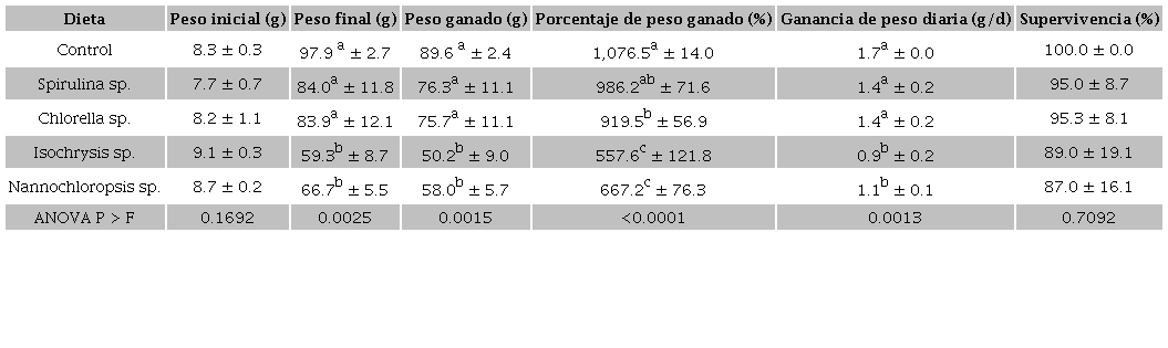 Es pertinente examinar la magnitud del crecimiento y supervivencia de los peces del presente estudio. Al final del bioensayo, los peces de los tratamientos con mejores resultados (control, Arthrospira sp. y Chlorella sp.) alcanzaron promedios de peso entre 83.9 y 97.9 g después de 53 días de cultivo, lo que representa para estos tratamientos ganancias en peso de 1.4 a 1.7 g/día, en tanto que sus promedios de supervivencia oscilaron entre 95 y 100%. Estos valores de crecimiento y supervivencia pueden considerarse buenos para estándares de cultivo de tilapia en tanques (Cantor-Atlatenco, 2007).