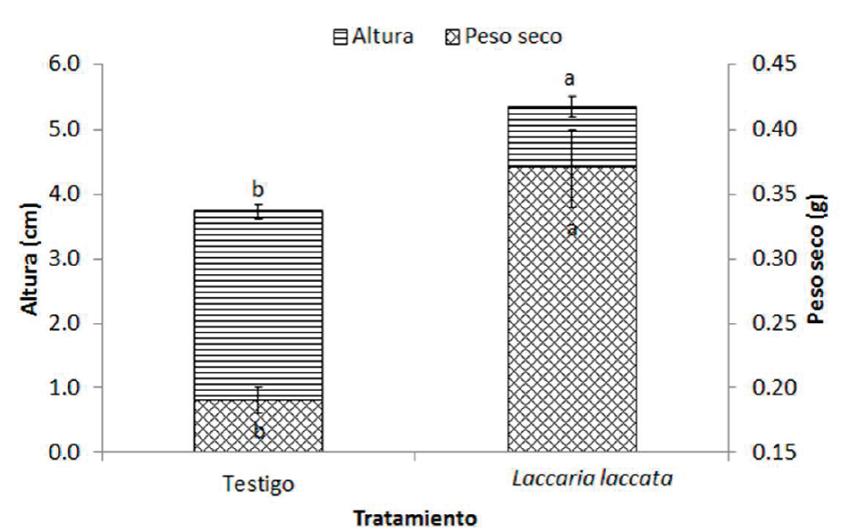 A los 180 días después de la siembra, las plantas del tratamiento inoculado con hongos ectomicorrícicos superaron en altura a las del testigo; con 5.4 y 3.7 cm (p<0.05), respectivamente. Mientras que en el peso seco se generaron valores de 0.19 g para el testigo y 0.37 g para el inoculado, como se muestra en la Figura 1. La inoculación con L. laccata aumenta el crecimiento de P. greggii; esto se ve reflejado en la altura y peso seco de las plantas. Un fenómeno similar en la altura de P. greggii fue observado por Rentería-Chávez et al. (2017) , usando la misma técnica (inóculo a partir de esporomas deshidratados) y carga microbiana en la inoculación (concentración de 107 a 108 esporas por g de inóculo) donde, después de 12 y 24 meses de la inoculación hubo diferencias estadísticas entre el tratamiento L. laccata y el testigo, en un sustrato con las mismas proporciones usadas en este trabajo. Lo cual indica que la influencia de la inoculación sobre el crecimiento de las plantas es constante en diversos estudios. Además, las plantas inoculadas son más resistentes al cambio de las condiciones ambientales que ocurren al trasplantarlas en campo, aumentando su índice de supervivencia (Valdés, 1986; Gómez-Romero et al., 2013).