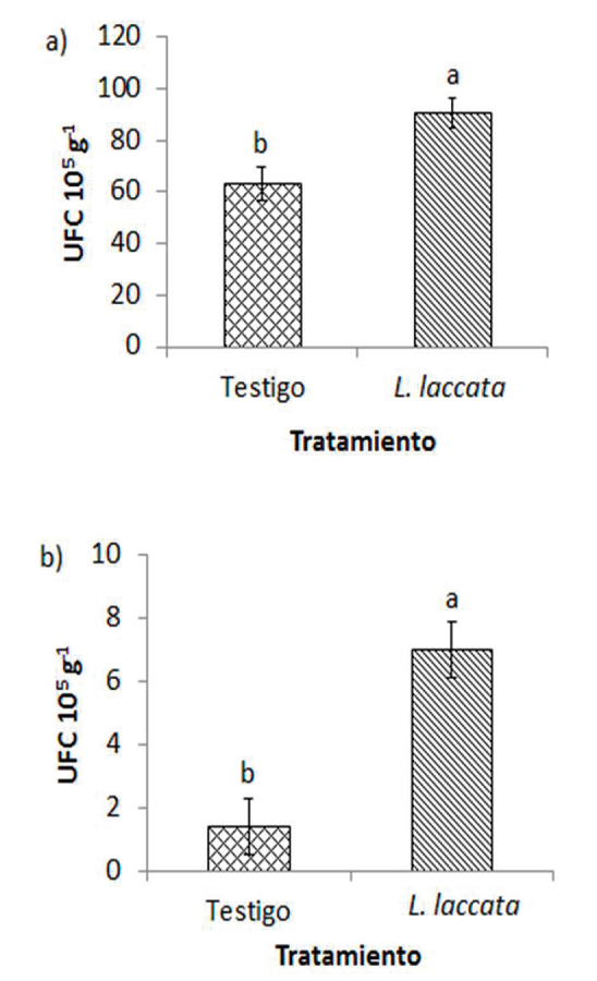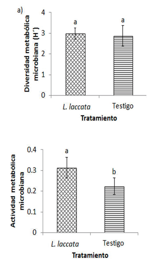 La diversidad metabólica microbiana, evaluada con el índice de Shannon-Weaver (H’) a las 48 h de incubación, no mostró diferencias significativas entre tratamientos: 2.97 en el inoculado con L. laccata y 2.87 en el testigo (Figura 2a). Sin embargo, la inoculación con L. laccata afectó claramente la actividad metabólica microbiana (AMM). En general, la AMM fue mayor en el tratamiento inoculado, con una lectura de 0.3 comparada con 0.22 en el testigo, ambas a 590 nm (Figura 2b).