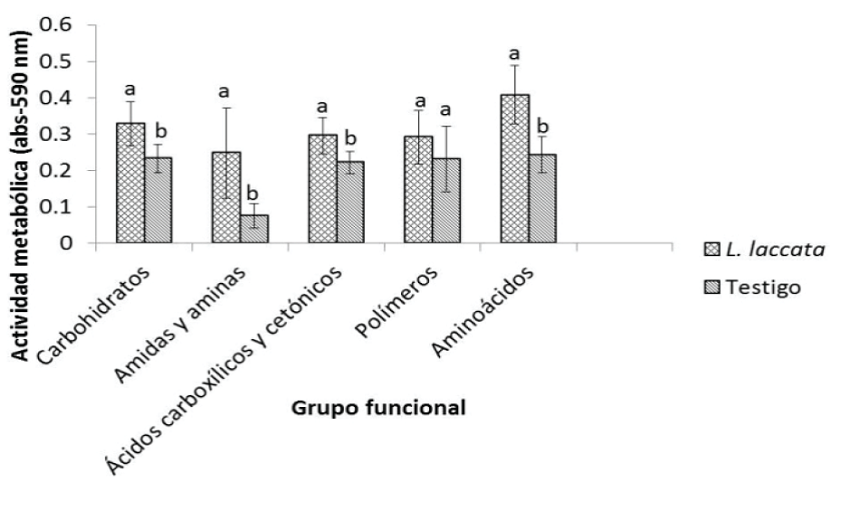 Los perfiles metabólicos de las comunidades microbianas cultivables de ambos tratamientos (testigo e inoculado con L. laccata), se determinaron con las microplacas Biolog ™ EcoPlates (BIOLOG Inc., Hayward, CA) que contienen diferentes fuentes de carbono. Se utilizó el procedimiento adaptado de Garland y Mills (1991) , posteriormente se realizaron diluciones seriadas desde 10-1 a 10-4. Se utilizó la dilución 10-3, de esta se tomó una alícuota de 150 µL y se depositó en cada uno de los pocillos, en el pozo A1 únicamente se le agregó 150 µL de agua destilada. Las placas se incubaron a 28 °C y la absorbancia fue leída a 590 nm., usando un lector de microplacas (Synergy2 MCA Bio-Tek). Las mediciones se realizaron a las 24, 48, 72 y 96 h de la incubación.