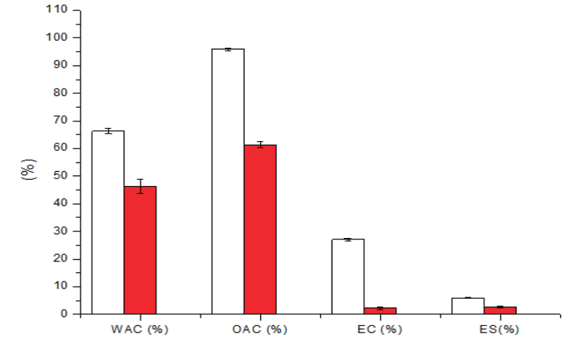 The oil absorption capacity (OAC) was determined following the method used by Jan et al. (2016); 4 g flour samples were mixed with 24 mL of vegetable oil and shaken manually every 5 min for a period of 30 min. Afterwards, samples were centrifuged at 3 328 rpm for 25 minutes and the supernatant was discarded carefully. The OAC value was calculated using the following equation: