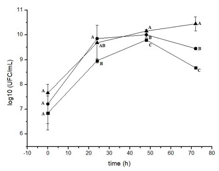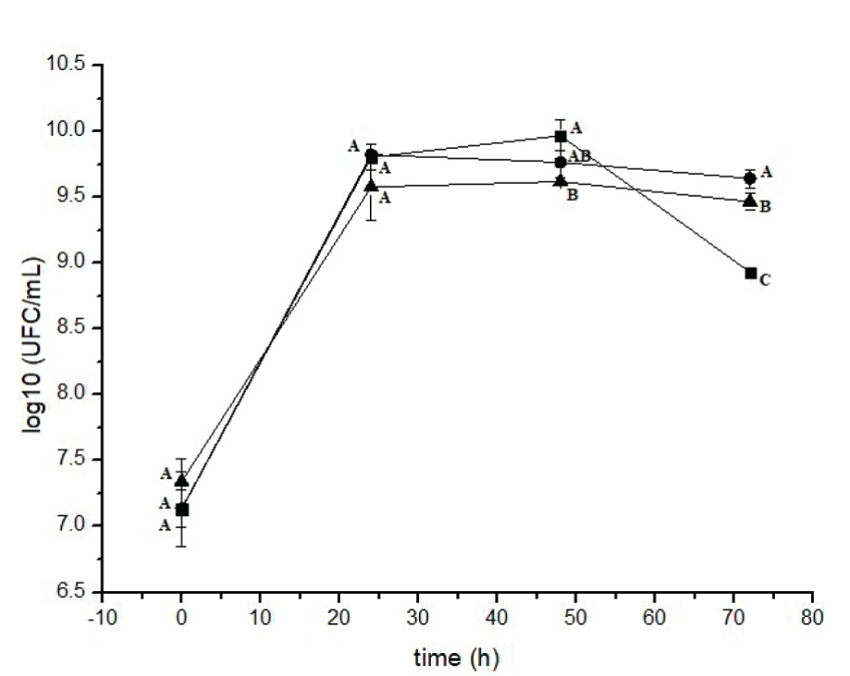 LA-3. Meanwhile, for the glucose-enriched sample (control), the population density decreased one logarithmic cycle in the 48-72 hours interval, reaching a value of 8.93 log10 CFU/ mL. Even so, it is likely that if the incubation time had been increased by more than 72 h, the probiotic bacteria would still have remained longer in the CF sample.