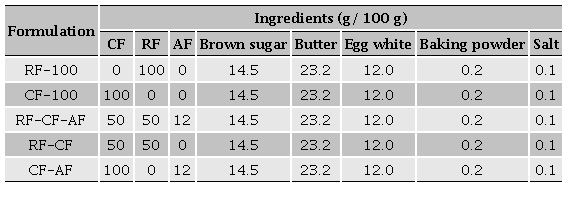 The spreading factor is an important parameter in the evaluation of cookies since, according to Giuberti et al. (2017), cookies with higher spreading factor values are more desirable to consumers, because it represents the ratio between the diameter and the thickness of cookies. Likewise, it gives the impression of expansion during baking. The results showed that the combination of CF and RF potentiate this parameter, obtaining values from 6.4 to 9.04. These values are higher than those found by Giuberti et al. (2017) in gluten-free rice cookies and gluten-free rice cookies with resistant starch, and by Kaur et al. (2017) in gluten-free flaxseed flour cookies, who reported values from 4.9 to 5.2 and 3.3 to 4.15, respectively. However, the value decreased in the formulations with AF. No significant difference was found between the hardness values of formulations that only contained a single type of flour (79.35 N in RF and 87.73 N in CF) or a combination of CF and RF (122.55 N). Despite this, there was an influence on the hardness parameter by AF, since the RF-CF-AF formulation showed the highest value, 201.82 N. This could be explained by the possible formation of complexes between the AF components and protein fractions of both flours (Santiago et al., 2017). The pH values did not show significant difference, constantly very close to neutral. According to the NMX-F-006-1983, these results are within the accepted quality pH parameters, of between 6.0 and 8.0 for cookies.