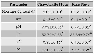 The color results showed that RF presented a higher luminosity value. The values of a* and b* in both flours were positive, showing closer proximity to red and yellow, respectively. The highest a* and b* values were obtained with CF, resulting in a darker color than RF. This behavior could be the result of the enzymatic darkening that the Chayotextle suffered during the peeling and cutting process, since it contains a significant amount of the Polyphenoloxidase enzyme. Likewise, this could be due to the drying temperature (50° C), which could cause some darkening reactions in the flour. L*, a* and b* showed significant differences with a value of P ˂0.05. The difference in the color of the flours could represent an inconvenience of mixing them in the preparation of cookies, resulting in a dark color, which could be unpleasant for consumers.