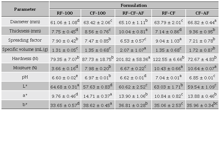 Table 3 shows the results of the physical properties analyzed for the different formulations of cookies. The values of diameter, thickness and specific volume were significantly influenced by the presence of CF, which caused a significant increase in the values of the formulations containing it (63.42 to 63.79 mm in diameter, 8.56 mm thick and 1.35 specific volume). However, the highest values correspond to the cookies containing both CF and FA (65.10 to 66.82 mm in diameter, 9.36 to 10.04 mm thick and 1.72 to 2.07 mm specific volume). This is possibly because fructans have the characteristic of being highly soluble, and thus promote the formation of gels that provide better baking characteristics in the cookies. Santiago et al. (2017) reported a similar behavior in wheat cookies with agave fructans.