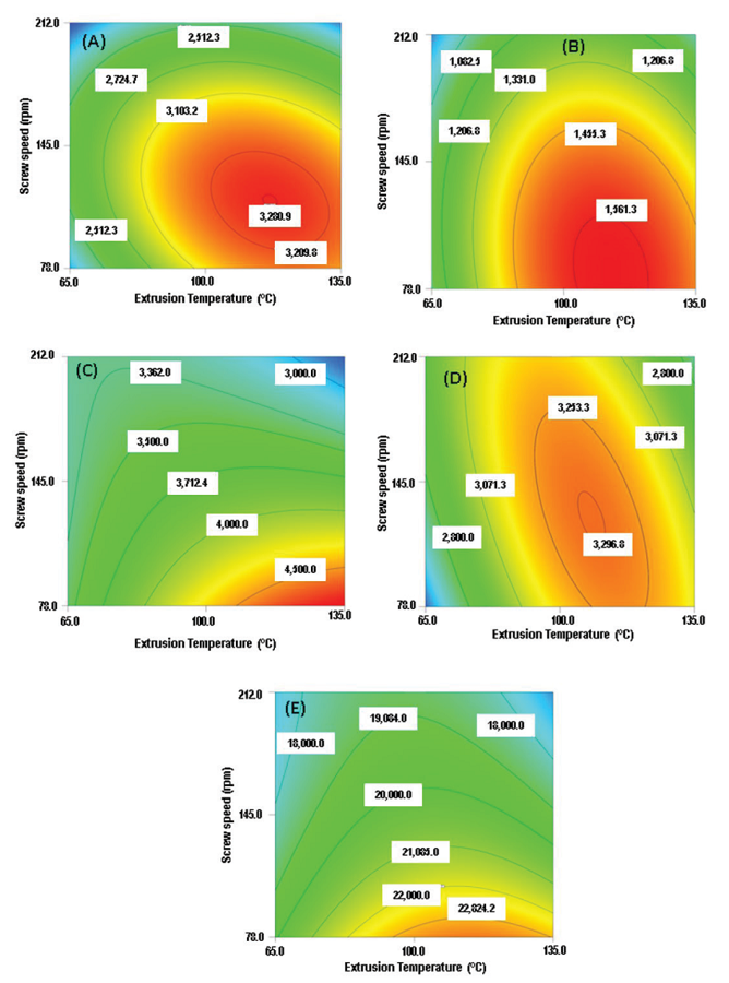 Data were subjected to the stepwise regression analysis; the significant terms (P<0.05) were used to fit the predictive model for each response variable (Khuri and Cornell, 1987). According to the software program, multiple response optimization was implemented throughout the desirability function (Derringer and Suich, 1980). To establish the desirability of several arrangements of the experimental process variables (ET and SS) were set as ‘‘in the range”, whereas that of response variables (LA, OA, CP, SP, and (SP) was a goal set to obtain maximum, and the desirability value was calculated. The arrangement of experimental factors yielding the uppermost desirability was nominated as the optimal lime extrusion cooking condition.