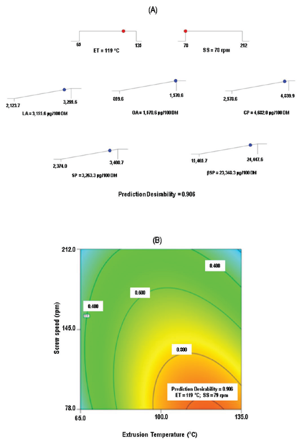 The fitness of the established model for the estimate was confirmed by relating the estimated and experimental values. The optimum condition (ET = 119 ºC and SS = 78 rpm) was experimentally tested to confirm the accuracy of the model equations, using the average values obtained in LA and OA experiments. CP, SP, and (SP under these optimal conditions were 3,019.9, 1,625.6, 4,484.9, 3,101.8, and 22,152.9 μg/100 g DW, respectively, which was in agreement with the predicted information (Table 3). The experimental results denote the correctness of the established quadratic models. It is noteworthy to mention that these best values are acceptable inside the specified array of process factors.