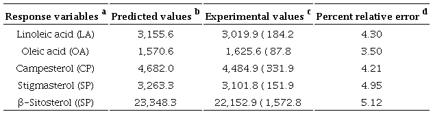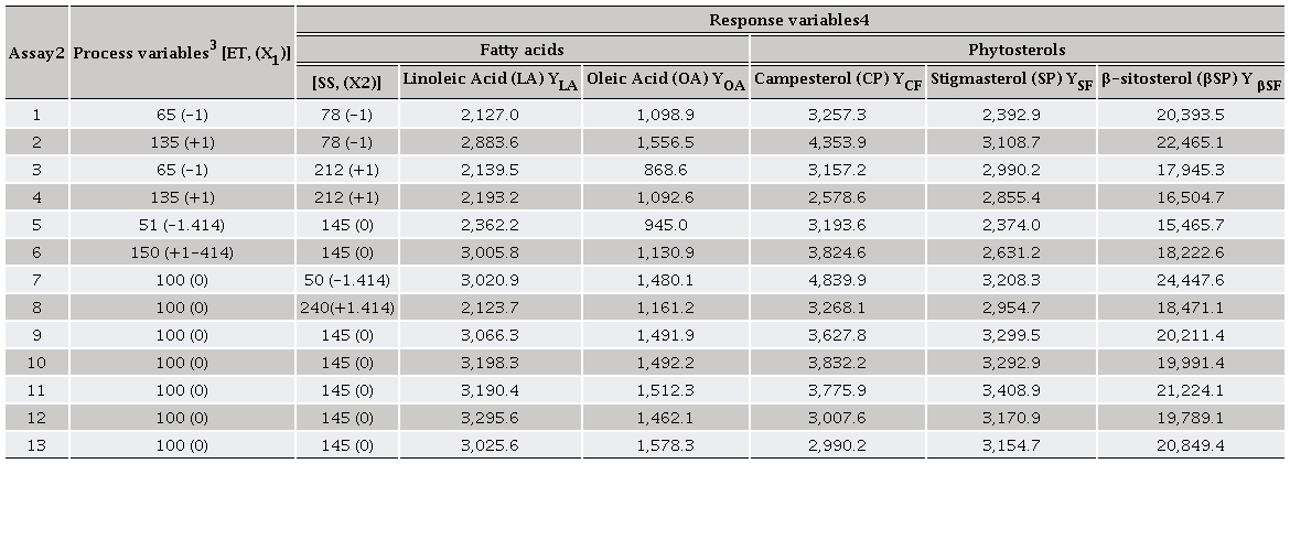 In this research, the RSM was used to determine the optimal experimental lime cooking extrusion process conditions (extrusion temperature and speed screw) to obtain extruded flour from mexican blue maize. The optimal response variables: fatty acids [linoleic (LA) and oleic (OA) acids], and phytosterols [campesterol (CP), stigmasterol (SP) and β-sitosterol (βSP)], in a central composite design (CCD) with two control variables, extruded temperature (ET) and speed screw (SS) were used. Maximum and minimum values were chosen according to previous data from preliminary trials. Table 1 shows the experimental design and the response data of tortillas made with extruded blue maize flours. The quadratic model applied to predict the response variables is given below.