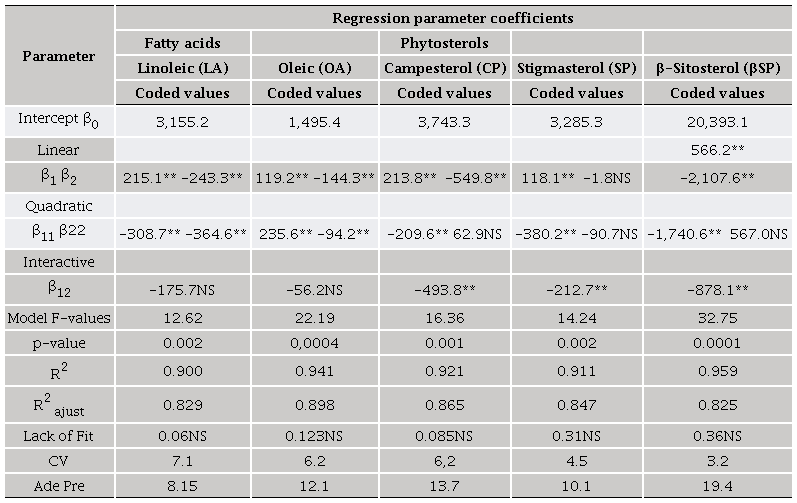 The regression analysis showed in linear terms (ET and SS), quadratic terms (ET)2, and interaction (ET)(SS), a significant effect on β-Sitosterol (βSP) of extruded blue maize tortillas (Table 2). The following equation can describe the predicted model for (SP in terms of coded values: