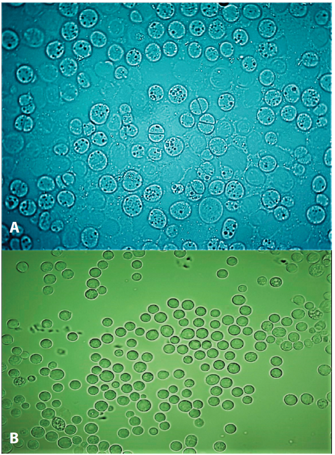 Thraustochytrium kinnei VAL-B1 y EMA-T5 fueron aisladas de agua marina en la costa chilena de la ciudad de Valparaíso (Centro, 33°03′47″S) y la antártica chilena (Sur, 75°00′30″S). Durante el período de muestreo la salinidad y temperatura del agua fue de 34,4 ppm y 16°C en Valparaíso y 33 ppm y 3°C en la antártica, lo cual muestra condiciones de adaptación diferenciada para cada cepa aislada. El aislamiento se llevó a cabo empleando el método de polen de pino (Gaertner, 1968; Bremer, 2000), con el cual se obtienen buenos resultados. Se toman 10 mg de polen de pino y se añaden a la muestra de agua (10 mL) manteniéndose por un período de 7 días a una temperatura de 25°C. Los granos de polen con los microorganismos adheridos son separados por filtración (filtro de nailon, 20 μm) y esparcidos sobre una placa de Petri con agar B: extracto de levadura (EL) 2 g/L, peptona (PEP) 2 g/L, agar 10 g/L, glucosa 5 g/L y sales en agua ANM preparada a una concentración final de 70 % p/v que contiene 300 mg/L de antibióticos (sulfato de estreptomicina y penicilina G) respectivamente, para evitar la proliferación de bacterias. Las placas fueron incubadas a 25°C hasta obtener colonias visibles. Luego colonias individuales fueron subcultivadas de nuevo en placas con agar B hasta obtener aislados puros, los cuales fueron comprobados por inspección en microscopio óptico (Zeiss, Estándar 20, Alemania), tal y como se aprecian en la figura 1.