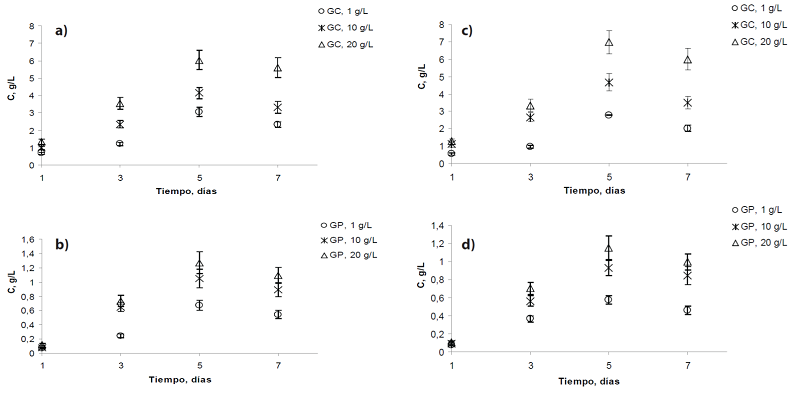 El inóculo se preparó transfiriendo células de la placa de agar en 50 mL de medio estéril B2 (para 1 L: glicerol, 10 g, EL, 2 g, glutamato de sodio (GS), 2 g y ANM filtrada a una concentración final de 70 % p/v). Se incubaron matraces de 250 mL por 48 h a 25°C con agitación orbital a 180 rpm. El material obtenido se utilizó para inocular (10 % v/v, densidad óptica del inóculo 0,4 a 600 nm) los fermentadores de 1 L que contenían 900 mL de medio, durante 7 días. Los experimentos con el GP y GC se trabajaron con valores de concentración de 1,10 y 20 g/L, empleándose un control. Las soluciones con la fuente de carbono y nitrógeno fueron esterilizadas separadamente (121 °C, 15 min.) y mezcladas para obtener la concentración requerida. Después de la esterilización, el pH del medio fue ajustado (con HCl o NaOH) a 6,8. Los datos empleados para realizar la curva de crecimiento se obtuvieron de cada fermentador utilizado cada 24 h. Los resultados corresponden al promedio de experimentos realizados por triplicado.