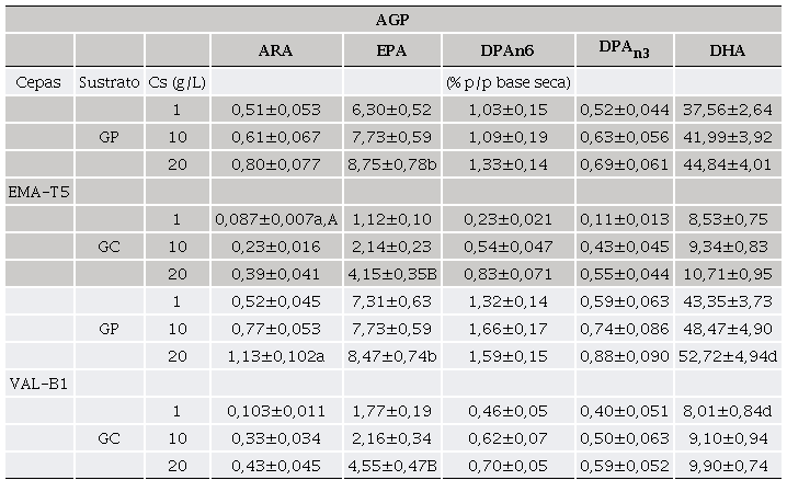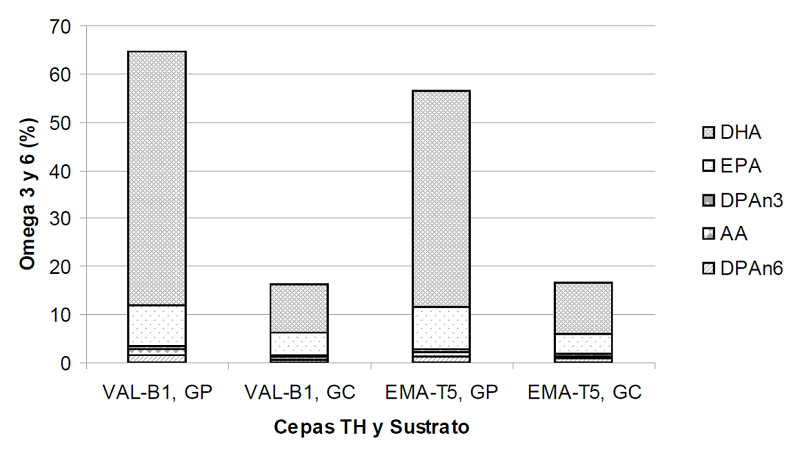Los porcentajes totales de AGP omega 3 en esta investigación, empleando GP son muy similares a los obtenidos en otros estudios, lo cual indica que dicho sustrato es aprovechado de igual forma por varias especies de TH y que efectivamente hay una afinidad importante por esta fuente de carbono. GC es una alternativa interesante, ya que es un subproducto que puede emplearse para obtener omega 3 y 6 de una fuente que no sea pura y aprovechar el menor costo que podría tener en un proceso productivo.