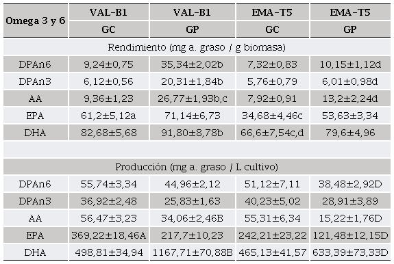 La producción de omegas 3 y 6, presenta un comportamiento diferente al hallado en los datos de rendimiento. Al comparar el GC versus el GP en las dos cepas estudiadas, los valores tienden a disminuir en la mayor parte de los omegas (contrario a lo que presento el rendimiento), excepto en el caso de la omega 3 DHA donde se nota una alta producción comparado con el GC, obteniéndose un valor máximo de producción de 1167,71 ± 70,88 mg/L con VAL-B1 al utilizar GP como sustrato. En el caso de EMA-T5 hay un aumento del 26,56 % al comparar el GP con el GC, sin embargo, aunque el valor de producción de DHA es alto - 633,39 ± 73,33 mg/L- con GP, este valor es menor al compararlo con el de VAL- B1 (ver Tabla 2). Un estudio realizado por Ethier et al. (2011), empleando S. limacinum SR21 con una concentración de GP de 90 g/L en un cultivo continuo, produjo 1740 mg/L de DHA, un valor cercano a lo reportado por Pyle et al. (2008) quién obtuvo 1630 mg/L de DHA usando la misma cepa con GC obtenido de la producción de biodiesel a partir de aceite de soya como sustrato y mayor un 49 % que lo reportado en este estudio con VAL-B1 creciendo en GP.