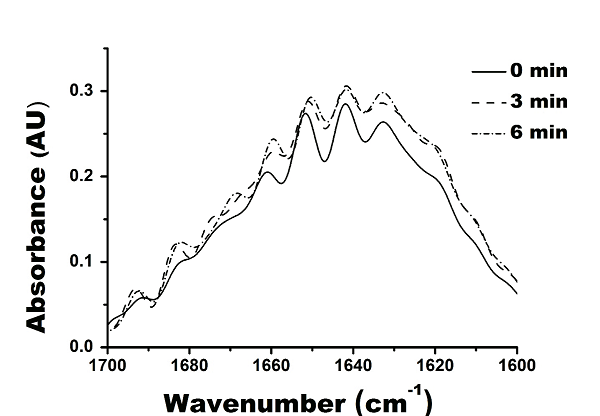 The deconvoluted FTIR spectras of the corn dough with 3 and 6 min of mixing time are shown in Figure 2. In order to establish a comparison between the structures, the selected spectra region was from 1700- 1600 cm-1, since this range relates to C- O interactions that constitutes amide I mode (Englander and Wand, 1987), while the amide I region is between 1600 - 1500 cm-1, associated with the N-H bending and C-N stretching modes (Curley et al., 1998). For the purpose of the present study, only the region of the amide I was considered for the secondary structure analysis, since changes in amide II are less reliable due to overlapped region with amino acid side chain vibrations (Chirgadze and Nevs- kaya, 1976); in addition, it is considered more sensitive to dough hydration (Wellner et al., 1996).