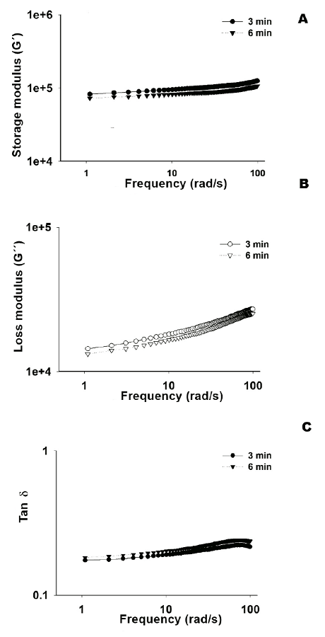 Figure 3 C shows the phase angle (Tan δ) values of corn dough at 3 and 6 min of mixing. It is observed that Tan δ values were higher with 6 min than 3 min of mixing. At both mixing times, Tan δ increased steadily with frequency, which indicates that the dough structure became stronger and presented a solid type behavior (Ferry, 1980). Values of Tan δ were in the range of 0.1 to 0.3, which indicate that the elastic behaviour predominate over the viscous one.