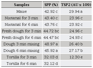 In general, the mixing increased the soluble protein proportion, and the proportion of soluble polymeric fractions. On the other hand, tortilla baking reduced the solubility of corn proteins. These results indicate that dough mixing induced the break of noncovalent and covalent bonds, due the physical strain (MacRitchie, 1975).