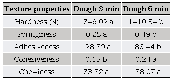 With respect to cohesiveness, defined as the strength of the internal bonds that make up the body of the product, we found that the dough with 6 min of mixing, obtained the highest cohesiveness values. In general, the dough with 3 minutes of mixing presented greater hardness and elasticity, but less cohesiveness. On the other hand, both doughs had no significant differences in the chewability characteristic. Research on corn dough with different cooking time and lime concentration, suggests that both variables have an effect on the adhesiveness of the dough, which increases directly proportional to the calcium content (Gracia-Amaya and Silva-Espinoza, 1992).