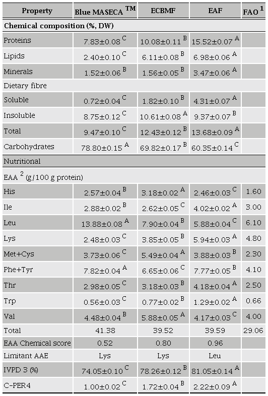 The essential amino acid (EAA) content of ECBMF and EAF is also shown in Table 1. In general, the EAA content of extruded grain flours was higher than those suggested by FAO (2013) for the requirement of EAA for children (3 years and older), adolescents, and adults; however in ECBMF and EAF Lys and Leu, respectively, resulted limiting amino acids. The in vitro protein digestibility (IVPD) of extruded grain flours ranged from 78.26 % (ECBMF) to 81.05 % (EAF). The highest C-PER (1.72-2.22) value corresponded to extruded amaranth flour (EAF) ( Table 1). The IVPD of seeds increased due to the destruction of antinutritional factors (trypsin, and chymotrypsin inhibitors) and protein denaturation, because of the applied conditions (cutting forces, temperature, and humidity) during the extrusion - cooking process ( Gamel et al., 2006; Montoya-Rodriguez et al., 2015).