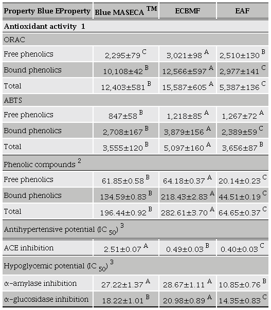 Table 2 shows the antioxidant activity, total phenolic content, and antihypertensive and hypoglycemic potential of extruded creole maize and amaranth flours (ECBMF, EAF). The AoxA, evaluated by ORAC methodology, of ECBMF and EAF, was 15,587 and 5,387 µmol Trolox equivalents (TE)/100 g sample DW, respectively. The commercial nixtamalized blue maize flour (blue MASECATM) showed an AoxA=12,403 µmol TE/100 g sample DW. The AoxA of the extruded grains, evaluated by ABTS methodology, showed a similar tendency. Extruded grain flours’ total phenolic content ranged from 64.65 to 282.61 mg Gallic acid equivalents (GAE)/100 g sample DW, showing the extruded amaranth flour (EAF) the lowest value.